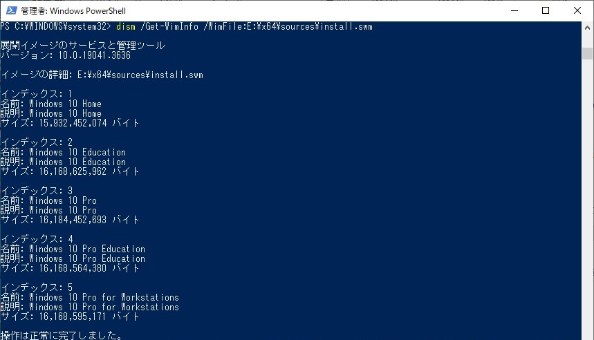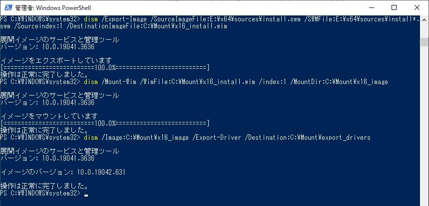 Windows PowerShellを起動しDISMとやらを使用して、分割されていたinstall.swmファイルを結合・マウントすることでWindows10インストールイメージ内のファイルにアクセスできるようになる。後はWinre.wimを取りだしてやればOKだった。